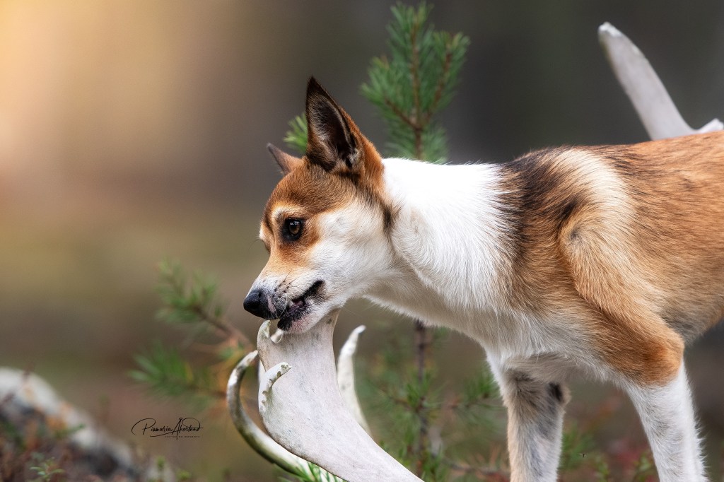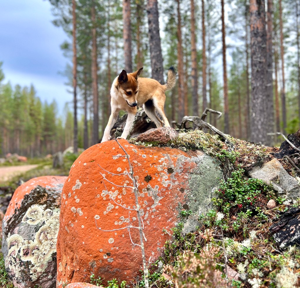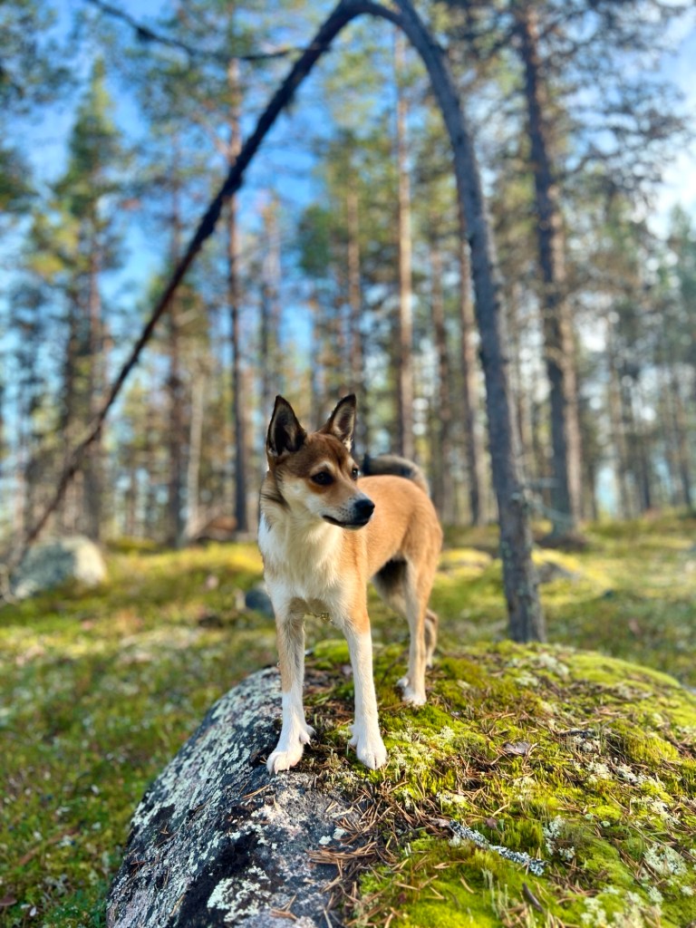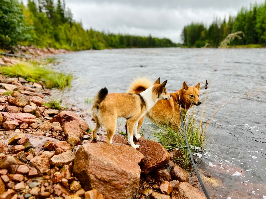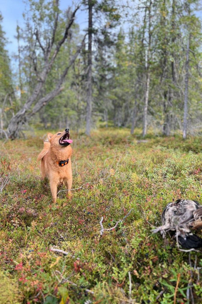 Kerran pääsi lunnikoiralapsikin tiedustelemaan maastoa kokeeseen – tahtoi vain olla niin, että tiedustelijalta loppui maavara. Ronja näki reissussa useita lintuja ja siitä on kehittynyt jo hyvä nostamaan linnut ylös – ja se ei mene kauas. Ronja sai kokea ja oppia niin paljon uutta; se opetteli ylittämään ojia, syömään mustikoita ja poron jätöksiä (meni ainakin 2,5kg yhteensä reissussa, aina oli poronkakka suussa), se on opetellut juomaan suon silmäkkeistä ja ojista, kiipeämään kivillä ja tähystämään korkealta. Se on haukkunut myös metsäkanalinnuille ja vartioinut leiriä tarmokkaasti. Lisäksi se toimi Ylimmäisenä Hyttysenpyydystäjänä teltassa. Kerran se tipahti koskeen – onneksi olin aivan vieressä ja nostin sen samoin tein ylös. Dolly hyppi kosken kiville ja pentu tietysti perään – mitenkäs muuten. Nyt kotona se juoksee fasaanien perään; taitaa olla niin, että siihen on tarttunut hiven lintuverta pystykorvilta.