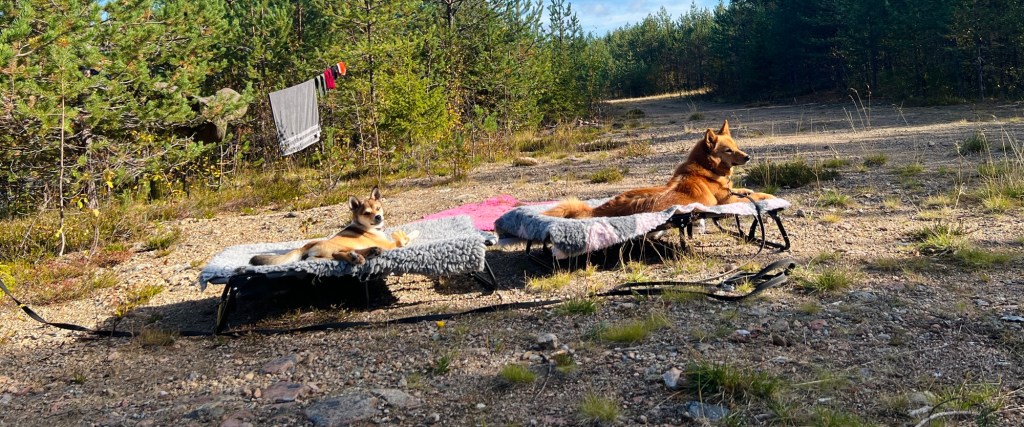 Tytöt tekivät juoksunsa juuri ennen reissua, Sumun tärpit olivat sillä viikolla, kun reissuun lähdettiin ja Dollyn tärpit jäivät reissuun – eli telttapäiviä tuli Dollylle useita, mutta eihän sitä olisi voinut reissusta poiskaan jättää. Dolly piti astuttaa tähän juoksuun, mikäli juoksut olisivat tulleet edes kuukautta myöhemmin, mutta nyt päätimme lykätä astutusta kevääseen – muutoin ei Dolly olisi päässyt ollenkaan metsälle tai kokeisiin.