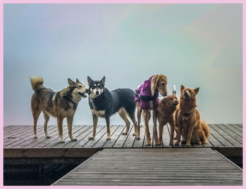 Sallan reissulta; tällaisen koiraryhmän kanssa sitä sitten oltiin liikenteessä. Kovin älykästä kuvaa he eivät itsestään anna…vasemmalta Hilja, Dolly, Olga ja Sumu.