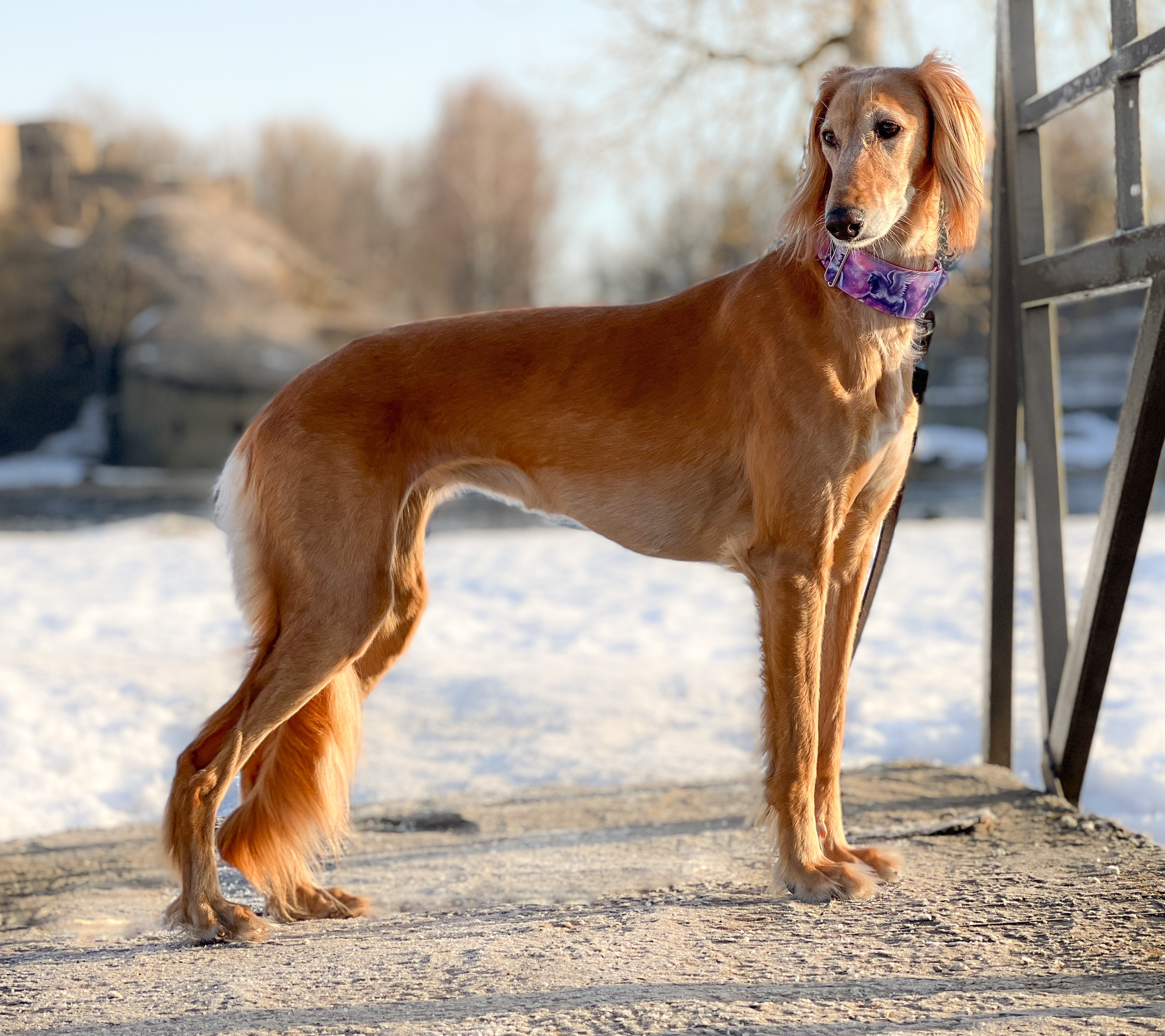 Vuonna 2012 alkuvuodesta meille oli tullut Olga, itäsiperianlaika. Ensimmäisenä syksynä totesin, että yksinhän minä lenkkeilin edelleen, sillä se oli aina metsällä. Meillä oli siinä elämäntilanteessa mahdollista ottaa toinenkin koira (Huom! Miten siinä sitten kävikään!) ja eri rotuja mietittyäni palasin aina salukiin. Siinä viehätti tietysti ulkomuoto, mutta halusin myös itsenäisen luonteen omaavan koiran, en kerta kaikkiaan ole palveluskoiraihminen.