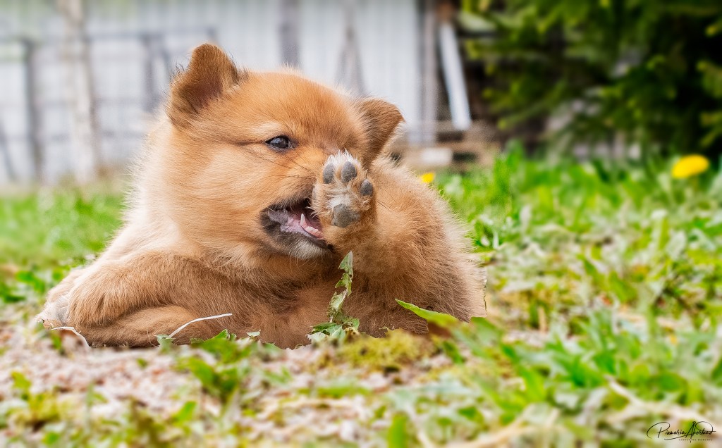 Meillä ei pitkään aikaan ole tällaista hammastelijaa ollutkaan. Purraan puntteja, nilkkoja, käsiä. Roikutaan aikuisten koirien häntäkarvoissa. Revitään hiuksista. Mahdoton ipana. Veikkauksia otetaan vastaan, milloin Dolly lopettaa puremisen. Kärsivällisesti kiljahdellen irrottelen sen hampaita paljaista nilkoista monen monta kertaa peräkkäin. Se on hyvin itsepäinen, mikä on tietysti hyvä asia. Mutta isojen koirien hännät – mitään itsesuojeluvaistoa sillä ei ole. Ei ollut kyllä Sumullakaan, pystykorvaiset pennut ovat omasta mielestään maailman keskipisteitä, oikeastaan koko universumi pyörii niiden ympärillä. Ne ovat kuin lapset tietyssä iässä- kuolemattomia.