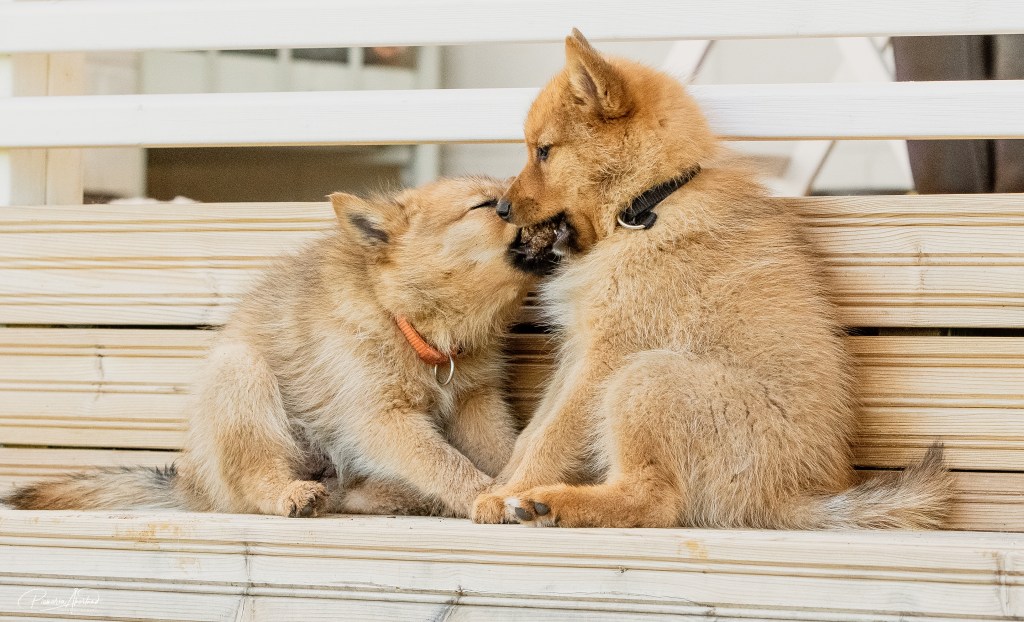 Käytiin Helsigissä tapaamassa veljeä. Tiedättehän sen ajatuksen, että ne pennut siellä sitten sulassa sovussa leikkivät ja niillä on tosi kivaa. Ei ollut Dollyllä kivaa; se tunnisti kyllä heti veljensä ja tappelu alkoi sillä sekunnilla, kun astuimme portista sisälle. Oli kai jäänyt jotain lapsuudesta hampaankoloon. Vaan osasihan se velikin ärsyttää: puri hännästä ja nousi selkään. Dollyllä en sellaista ilmettä ole nähnyt ennen – se oli tosi pahana. Että eikö näistä sisaruksista jo kerran päästy eroon. Se ei kotona koskaan, edes emon kanssa, ole ollut tuollainen. Se on aika alistuva kotioloissa isoille koirille (järkevää) ja mitä olemme leikkineet koirakoulussa, on kaikki mennyt todella hienosti. Kyllä ne hetken kaivelivat yhdessä, että ei se ihan koko aikaa tappelua ollut. Suku on pahin, eikö? Palautui mieleen, miksi päädyimme valitsemaan Dollyn: se oli niin pahansisuinen, ettei sitä olisi voinut kenellekään myydä. 😅