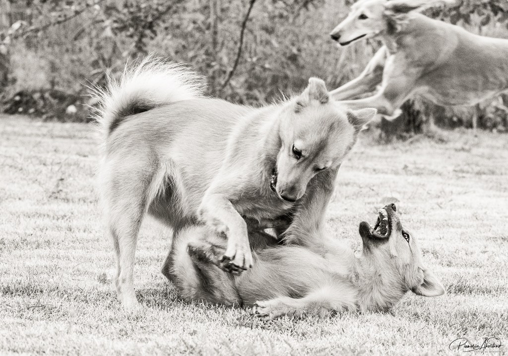 Sumu leikkii onneksi Dollyn kanssa, edelleen hoitaa sitä ja pitää huolta. Juoksevat ja riepottavat leluja, kaivavat yhteistä kuoppaa. Nukkuvat vierekkäin. (Paitsi yöllä, jolloin Dolly nukkuu minun tyynylläni.) Syövät samasta kupista. Mielenkiinnolla jään seuraamaan, millainen dynamiikka niiden kesken muodostuu aikuisena. Sumu hoiti Leiaa sen tultua meille. Sumu täytti juuri tuolloin yksi ja jaksoi hoivata Leiaa siihen saakka, kun se kasvoi Sumua korkeammaksi. Vaikka hoivakäyttäytyminen loppui siihen, Sumun mielestä Leia on aina ja ikuisesti sen alapuolella laumassa ja sitä saa komentaa – Leiahan tietysti ei tähän taivu, saluki on verrattain omanarvontuntoinen. Tämä asetelma tuskin koskaan muuttuu, mutta sen kun tietää, voi ongelmat välttää.