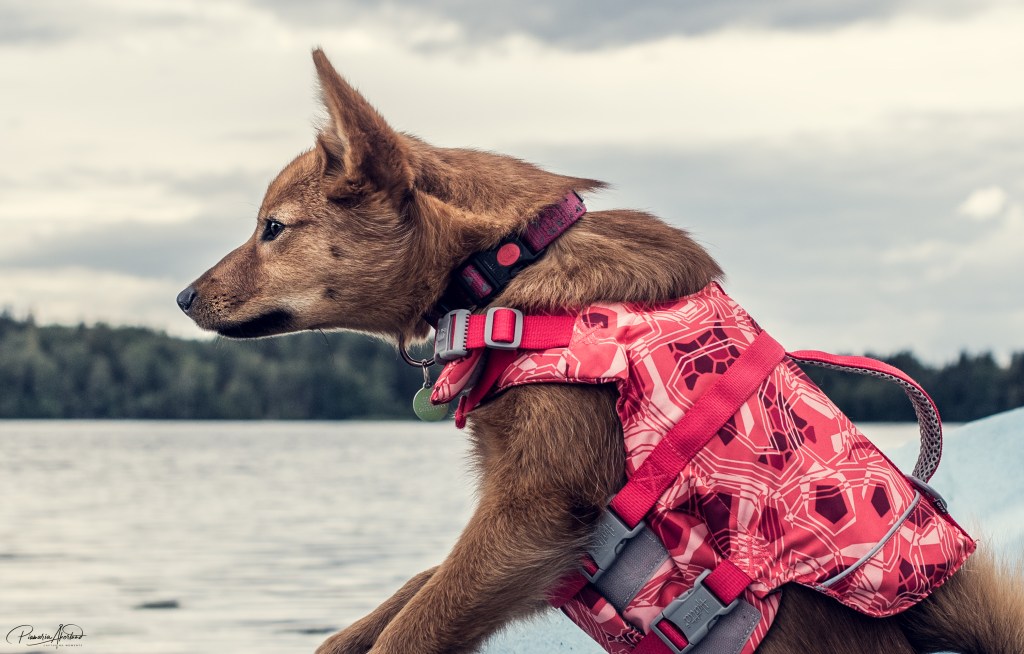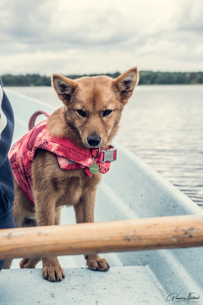 Käytiin veneilemässä Dollyn kanssa. Oli oikein kiva reissu; Dolly näki kanadanhanhia. Mentiin aika lähelle, mutta ei kuitenkaan liian lähelle. Pysyi se veneessä, mutta oli kovasti kiinnostunut. Isoja lintuja, se mietti. Dollya harmitti siellä veneessäkin, ainakin ennen niitä hanhia. Sillä on sellainen myrtynyt ilme, jonka se ottaa, jos joku ei miellytä.