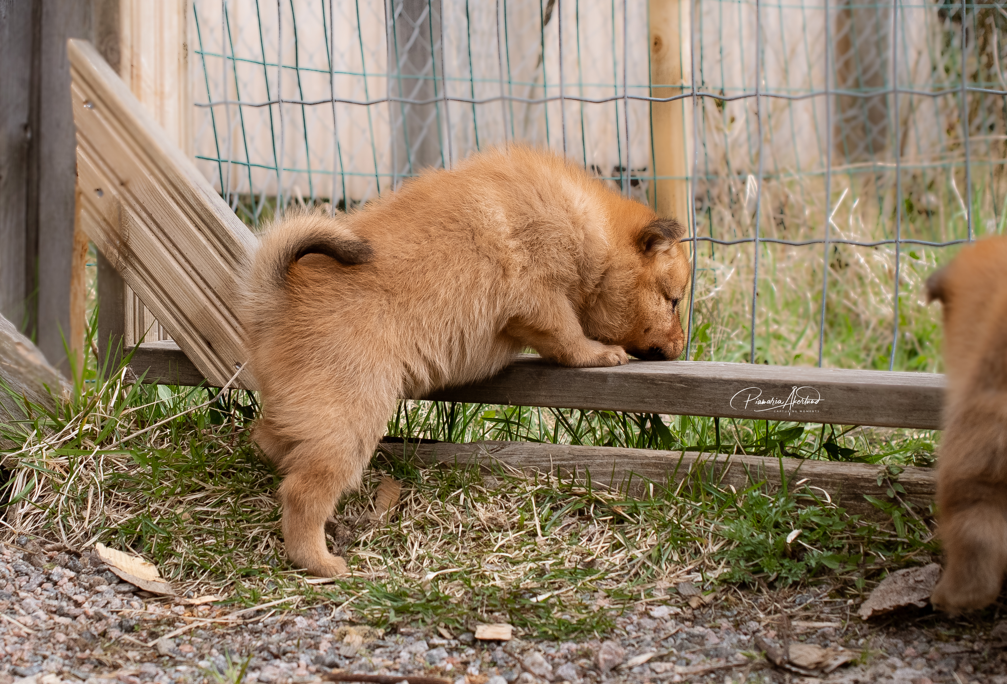 Pennut ovat nyt tutustuneet koko isoon aidattuun pihaan, saaneet kuopsutella hiekkakasassa ja kirmata nurmikolla. Kiivenneet portaita ja muksahdelleet sieltä alas. Tavanneet myös nuoremman salukin Leian, joka on todella leikkisä ja ystävällinen, mutta melko iso pitkine koipineen, jonka vuoksi en oikein uskalla sen antaa leikkiä pentujen kanssa, ettei mitään satu, jos joku jää sen jalkoihin. Leia kyllä näyttää rakastavan pentuja kovasti ja livahtaa aina kun mahdollista tapaamaan niitä.