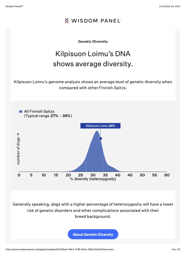 Kilpisuon Loimu’s genome analysis shows an average level of genetic diversity when compared with other Finnish Spitzs.
