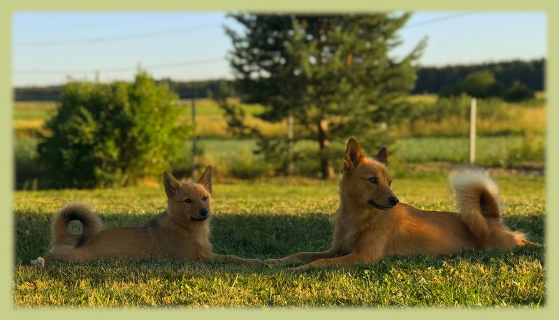 Riiviöt ovat olleet tarhassa päivät nyt viikonlopun ajan. Ja saavat olla jatkossakin päivät. Sisälle tulevat yöksi tietysti ja niiden kanssa seurustellaan melkein koko hereillä olo ajat. Kyllä ovat nauttineet olostaan – uni on maistunut kopissa pahnoissa ja ai että miten on tilaa juosta ulkona. Tarhasta on tehty turvallinen pennuille virittämällä yläosaan oranssia narua (300m) pitämään kanahaukat poissa. Mammakoira on tietysti siellä heidän kanssaan. Kynnyksiä on laitettu, että pääsevät hyvin koppiin ja sieltä pois. Vieraita on käynyt viikolla ja viikonloppuna ja riiviöt ovat saaneet paljon paijauksia ja uusia tuttavuuksia.